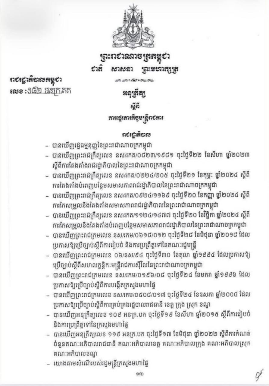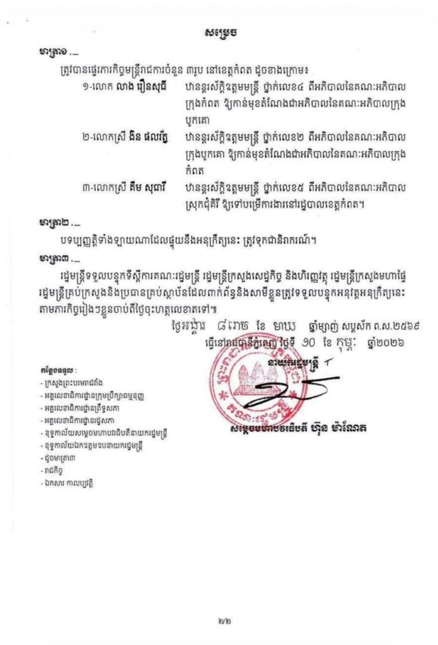 ផ្សាយចេញពីភ្នំពេញ៖ យោងតាមអនុក្រឹត្យលេខ១៥២ អនក្រ.តត ចុះថ្ងៃទី១០ ខែកុម្ភៈ ឆ្នាំ២០២៦ របស់សម្ដេចមហាបវរធិបតី ហ៊ុន ម៉ាណែត នាយករដ្ឋមន្រ្តីនៃព្រះរាជាណាចក្រកម្ពុជា