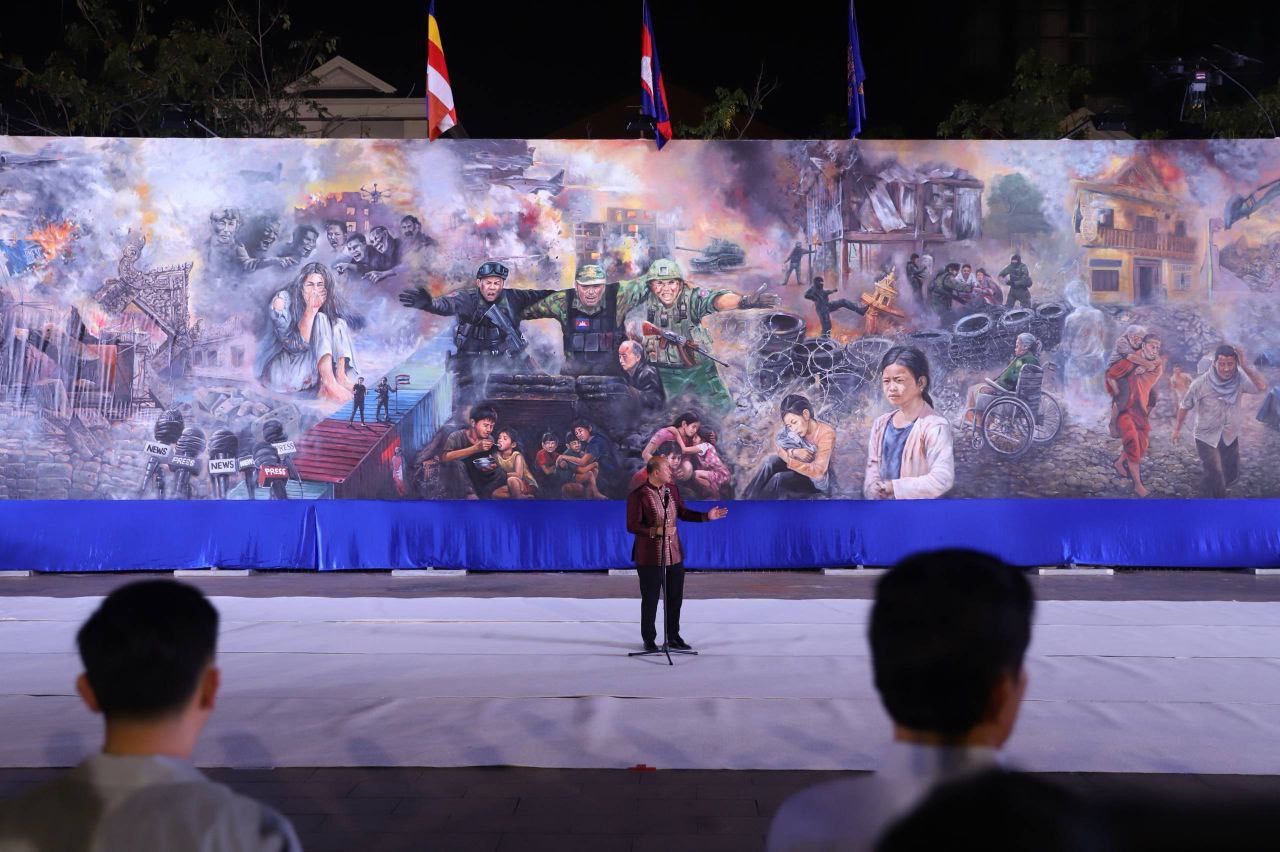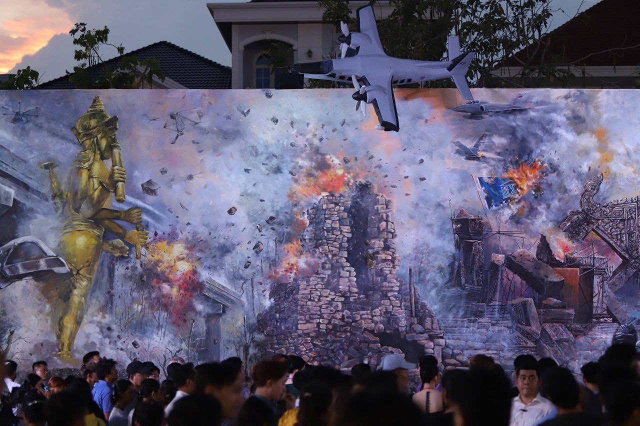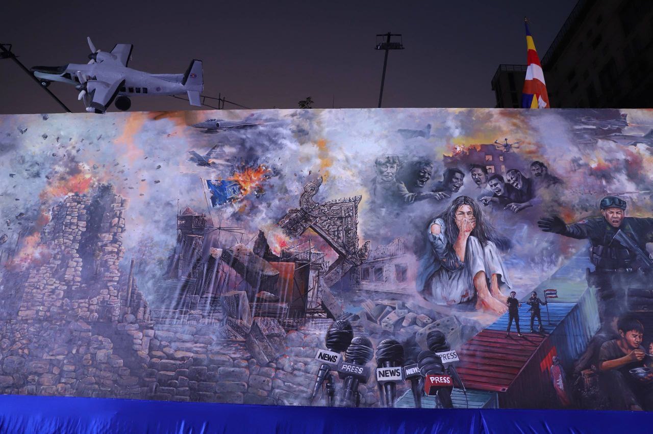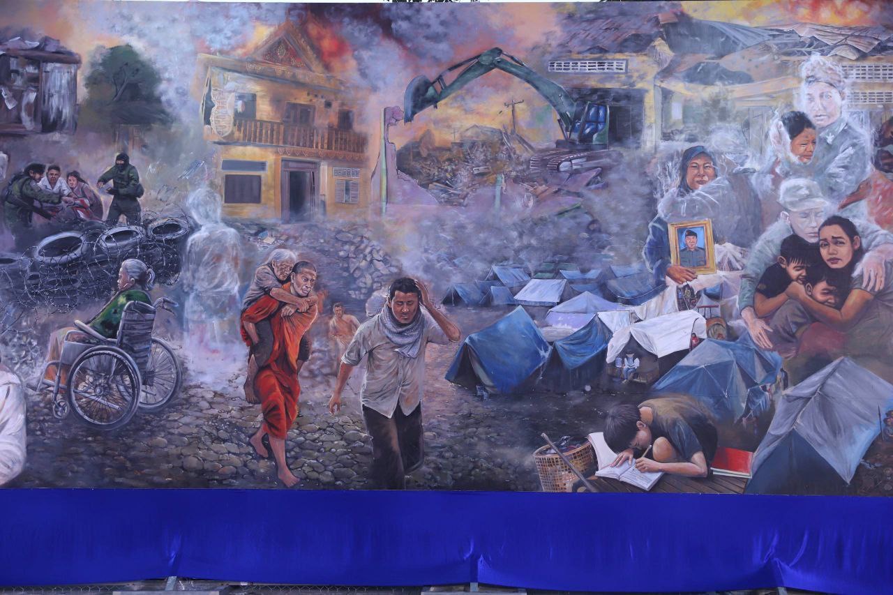 គំនូរសិល្បៈដើម្បីសន្តិភាពផ្ទាំងទី២ ដែលបង្ហាញពីសោកនាដកម្មនៃសង្រ្គាមឈ្លានពានរបស់ថៃ មកលើដែនអធិបតេយ្យភាពកម្ពុជា បានបញ្ចប់ការគូ និងត្រូវបានសម្ពោធជាផ្លូវការ នាល្ងាចថ្ងៃទី៣ ខែមីនា ឆ្នាំ២០២៦នេះ នៅមុខវត្តបទុមវតី។