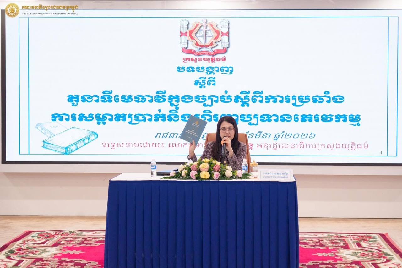 រាជធានីភ្នំពេញ ត្រូវនឹងថ្ងៃទី៥ ខែមីនា ឆ្នាំ២០២៦ សិក្ខាសាលាស្តីពី «តួនាទីមេធាវីក្នុងច្បាប់ស្តីពីការប្រឆាំងការសម្អាតប្រាក់ និងហិរញ្ញប្បទានភេរវកម្ម» ត្រូវបានរៀបចំឡើងក្រោមអធិបតីភាពលោកមេធាវី សាំង វណ្ណៈ ប្រធានគណៈមេធាវីនៃព្រះរាជាណាចក្រកម្ពុជា ដោយមានវាគ្មិនកិត្តិយសលោកជំទាវ សុង ឆវ័ន្ត អនុរដ្ឋលេខាធិការនៃក្រសួងយុត្តិធម៌ និងមានវត្តមានថ្នាក់ដឹកនាំគណៈមេធាវី សមាជិកគណៈមេធាវី ព្រមទាំងសិស្សមេធាវីចូលរួមសរុបចំនួន ១៨៧ នាក់។