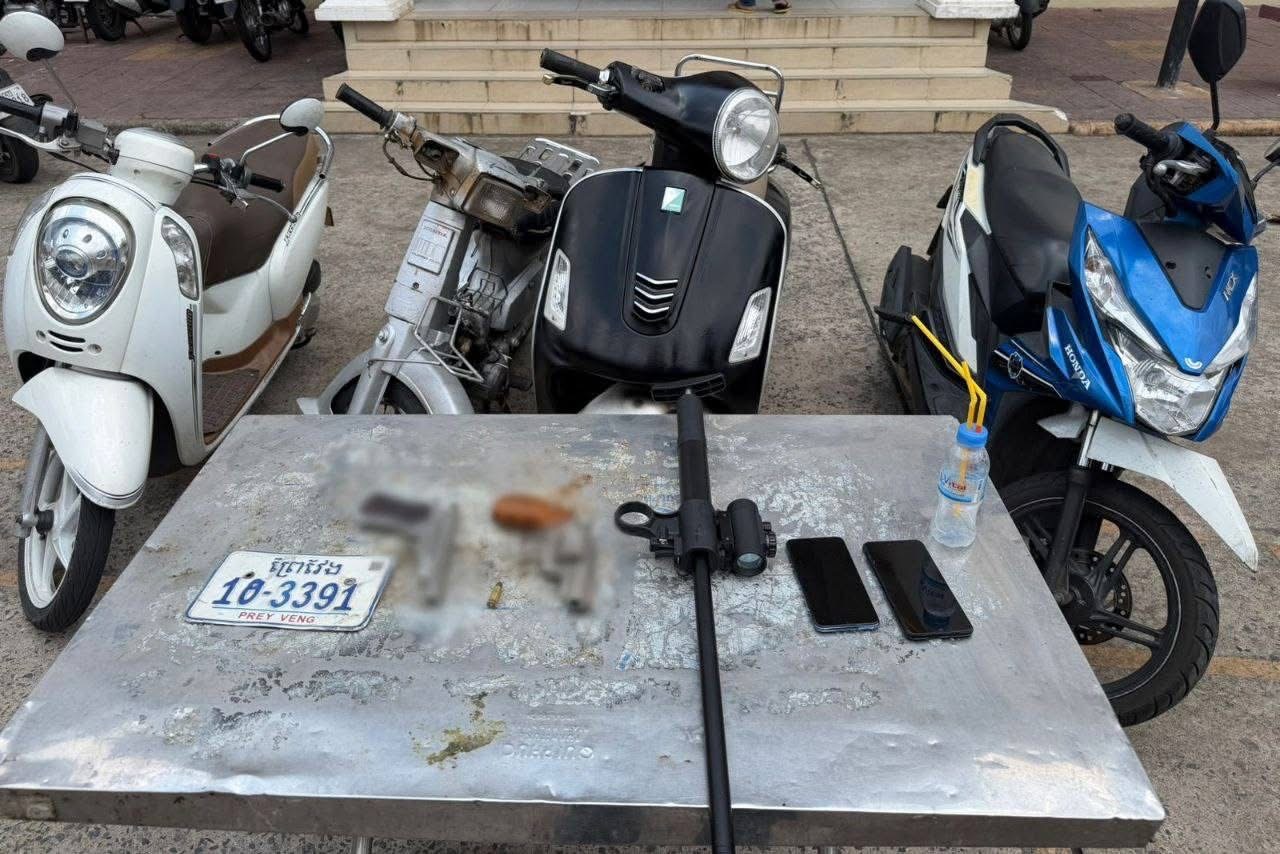 ដោយអនុវត្តតាមបទបញ្ជារបស់ឯកឧត្តម ឧត្តមសេនីយ៍ឯក ជួន ណារិន្ទ អគ្គស្នងការរង និងជាស្នងការនគរបាលរាជធានីភ្នំពេញ នៅថ្ងៃទី១៧ ខែ មីនា ឆ្នាំ២០២៦ កម្លាំងផ្នែកជំនាញ នៃអធិការដ្ឋាននគរបាលខណ្ឌទួលគោក សហការជាមួយកម្លាំងអធិការដ្ឋាននគរបាលខណ្ឌឫស្សីកែវ បានធ្វើការស្រាវជ្រាវឃាត់ខ្លួនជនសង្ស័យ០២នាក់ ពីបទលួចយកម៉ូតូ និងកាន់កាប់ ឬដឹកជញ្ជូនអាវុធដោយគ្មានការអនុញ្ញាត ប្រព្រឹត្តបទល្មើសនៅចំណុចមុខផ្ទះលេខ២០៥ ផ្លូវលេខ១៣២ សង្កាត់ទឹកល្អក់ទី១ ខណ្ឌទួលគោក កាលពីថ្ងៃ១៣ ខែមីនា ឆ្នាំ២០២៦។