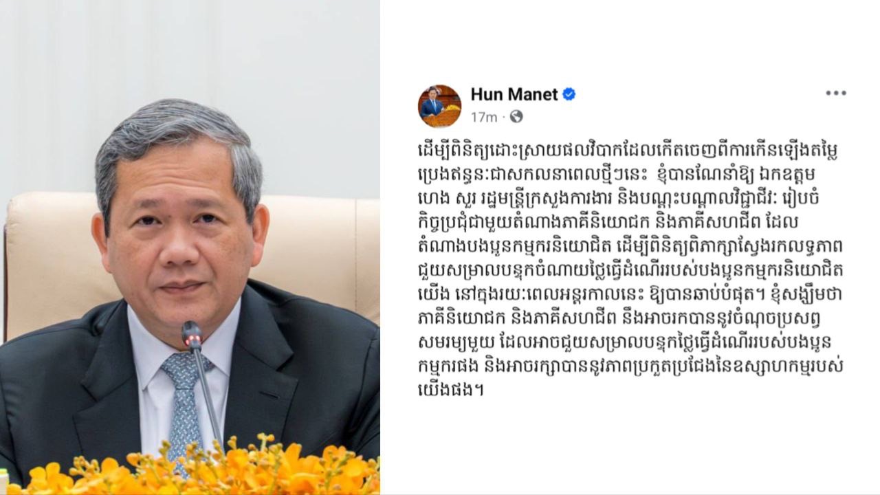 សម្តេចមហាបវរធិបតី ហ៊ុន ម៉ាណែត នាយករដ្ឋមន្ត្រីនៃកម្ពុជា នាថ្ងៃទី១៩ ខែមីនា ឆ្នាំ២០២៦នេះ បានណែនាំឱ្យលោក ហេង សួរ រដ្ឋមន្ត្រីក្រសួងការងារ និងបណ្តុះបណ្តាលវិជ្ជាជីវៈ បើកកិច្ចប្រជុំពិភាក្សាជាបន្ទាន់ជាមួយភាគីពាក់ព័ន្ធដើម្បីស្វែងរកលទ្ធភាពជួយសម្រាលបន្ទុកចំណាយថ្លៃធ្វើដំណើររបស់បងប្អូនកម្មករនិយោជិត។