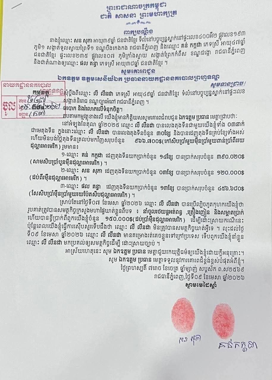 បច្ចុប្បន្ន ឈ្មោះ លី លី លីនដា កំពុងត្រូវបាន សមត្ថកិច្ច ក្រសួងមហាផ្ទៃ ដើម្បីដោះស្រាយតាមច្បាប់។