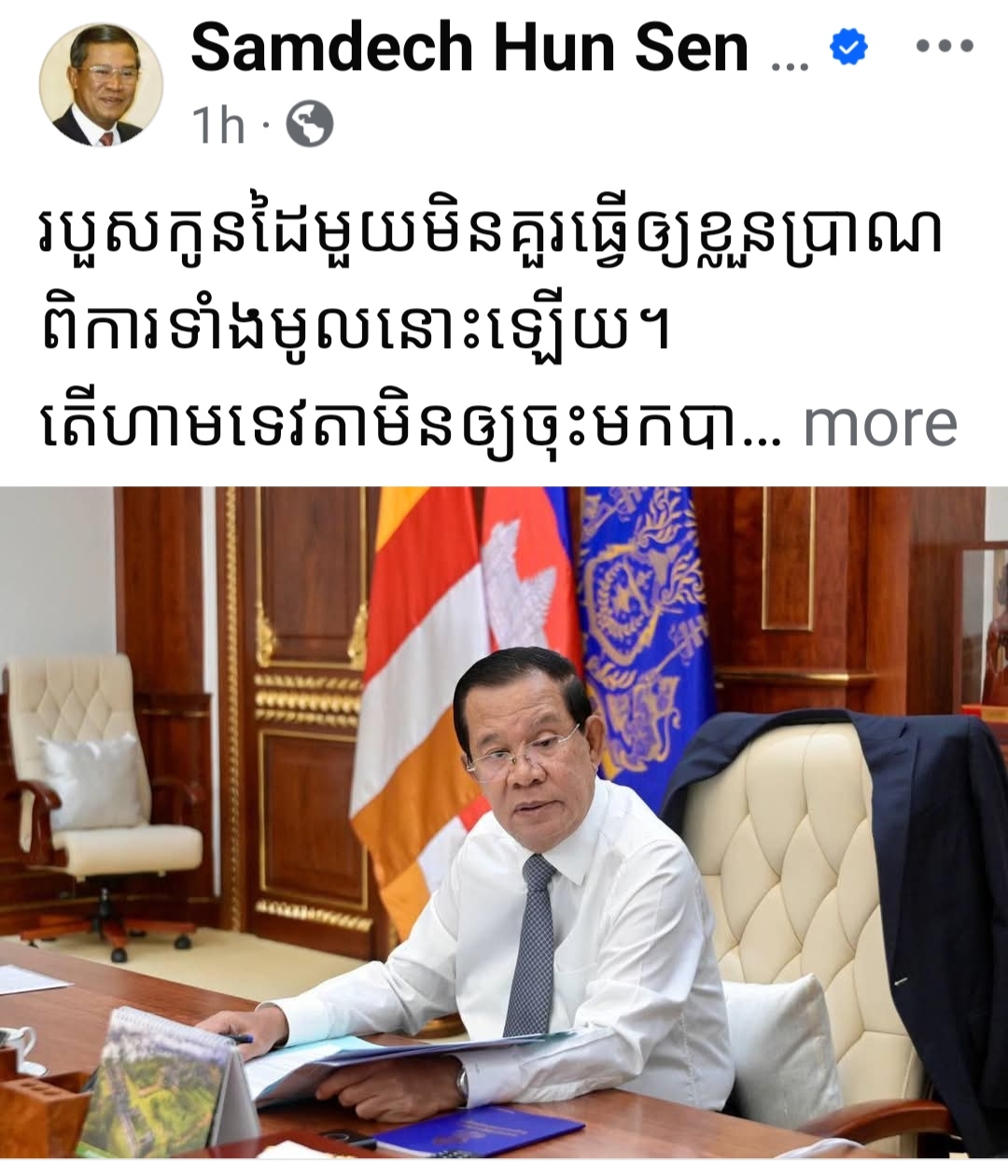 នៅរសៀលថ្ងៃទី១៤ ខែមេសា ឆ្នាំ២០២៦ ដែលត្រូវជាថ្ងៃទី១នៃពិធីបុណ្យចូលឆ្នាំថ្មីប្រពៃណីជាតិខ្មែរ សម្ដេចតេជោ ហ៊ុន សែន ប្រធានព្រឹទ្ធសភានៃព្រះរាជាណាចក្រកម្ពុជា បានបង្ហោះផ្សាយខ្លឹមសារដូចខាងក្រោម៖