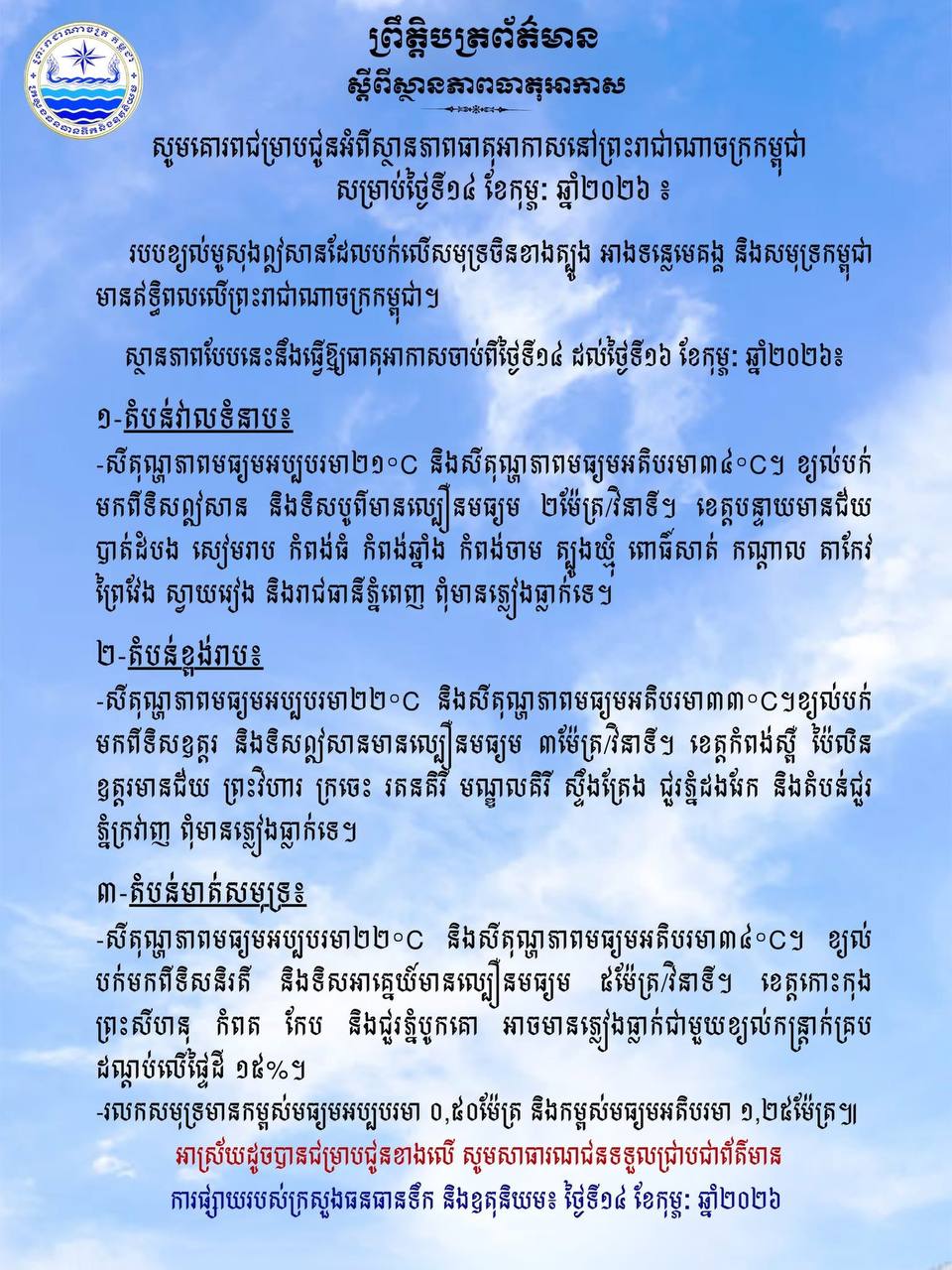 ក្រសួងធនធានទឹក និងឧតុនិយម ចេញសេចក្តីជូនដំណឹងពីស្ថានភាពធាតុអាកាស សម្រាប់ថ្ងៃទី១៤ ខែកុម្ភៈ ឆ្នាំ២០២៦នេះ ព័ត៌មានជាតិ ដោយ រស្មីទូកមាស ផ្សាយ Feb 14, 2026 FacebookTelegram
